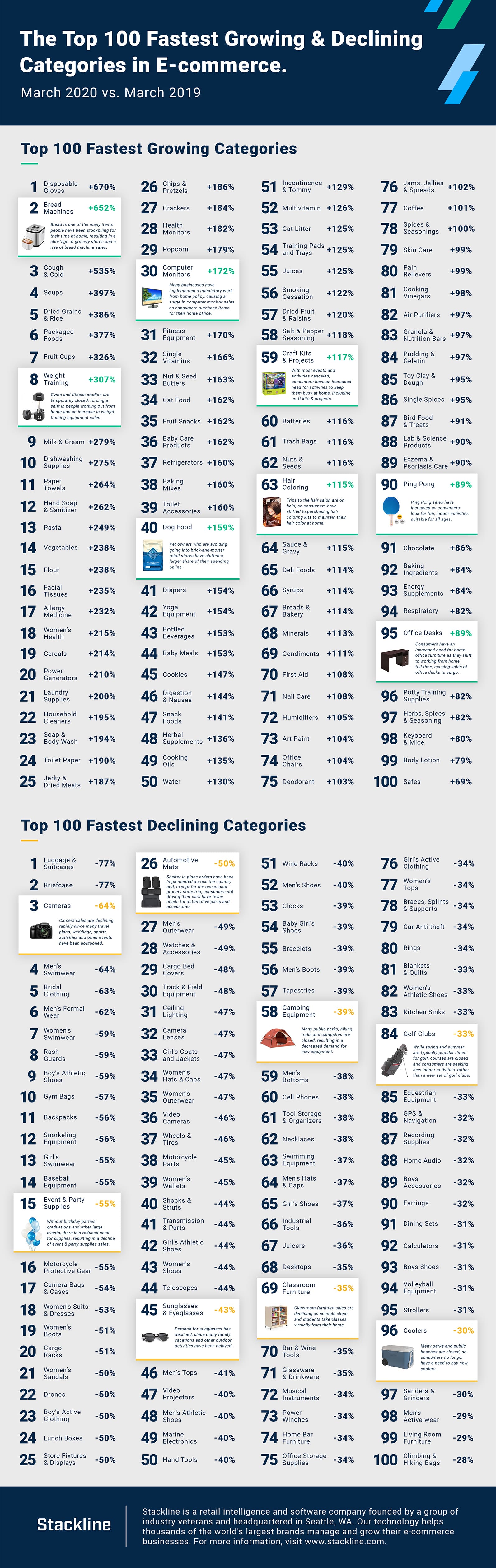 Lista das Top 100 Categorias que aumentaram e reduziram vendas no Ecommerce durante o COVID-19 em março de 2020.